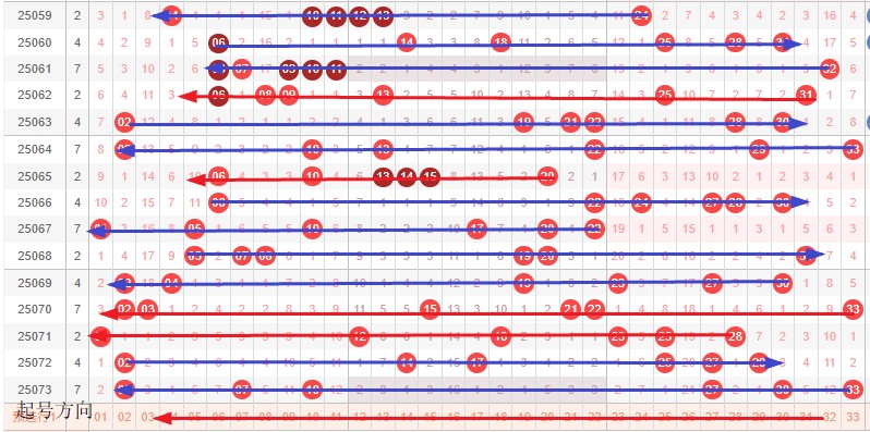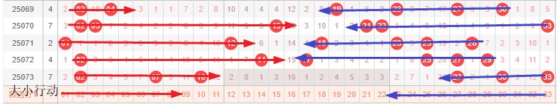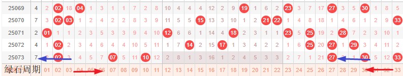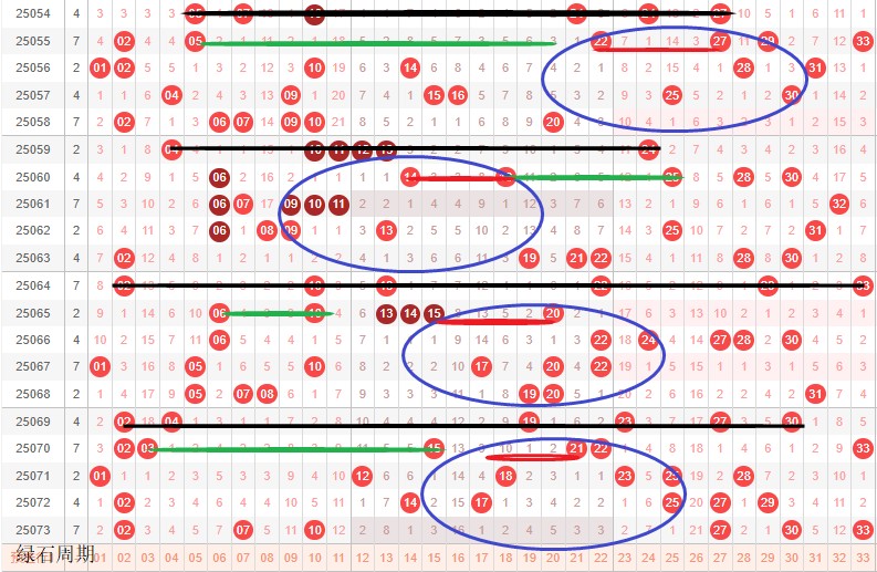 如图所示:体现的是3个局部走势的发展周期,圆圈为密集处的填空,本期定性为新局部走势1期,画线期造成号码密集,主动调整空间,蛋跨中间应放1枚点位,蛋跨本周期预估在1-2区交界处开出。代表这里是空的,代表10-27号码布局2-3枚,关键在于2-7和30-33能否造成合并,不合并,则10-27开出3枚号码,合并则开出1-2枚号码。即号码出在1-3区或者2-3区为主。