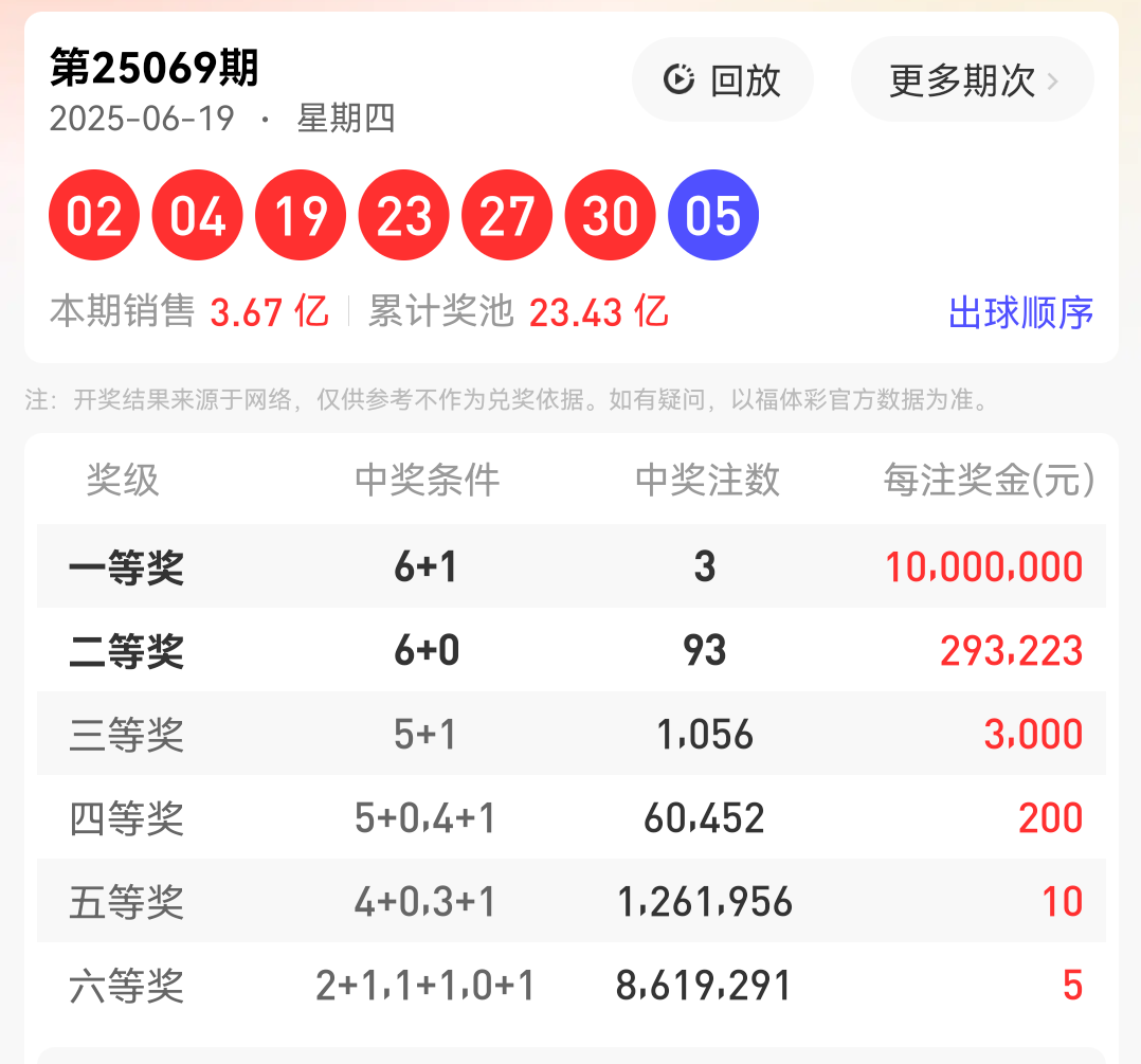 上期回顾:福彩双色球红球开出02,04,19,23,27,30,蓝球开出05。