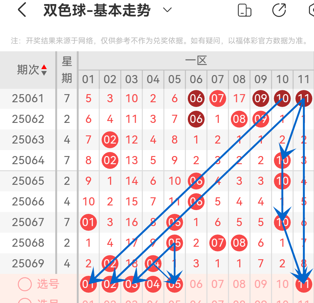 上期一区开奖号码出2个,近100期开奖中,一区号码表现较热,本期预计一区号码会继续开出,持续稳定;根据历史走势图可得,上期出现02码,04码时,下期出现01码,03码,04码,概率为70.3%,根据同时期走势图可得下期出现02码,05码,11码概率为70.2%;本期一区关注号码01,02,03,04,05,11。