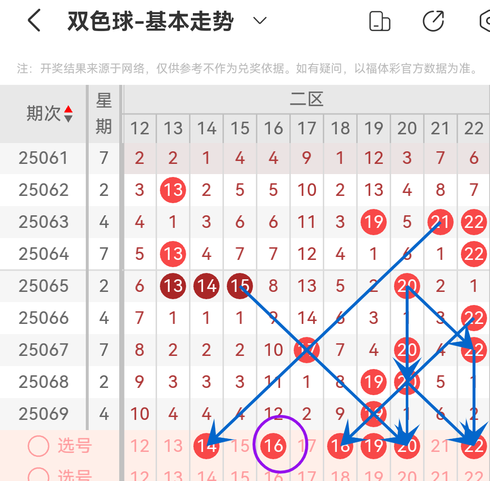 上期二区开奖号码开出1个,近100期开奖中,二区号码比较活跃,属于大热号,证明二区一直属于大优势,根据历史走势图可得,上期出现19码时,下期出现14码,16码,18码概率为70.3%,根据同时期走势图可得下期出现19码,20码,22码概率为70.2%;本期二区关注号码14,16,18,19,20,22。