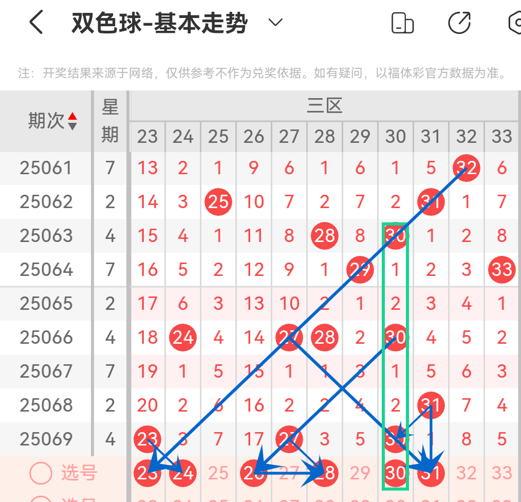 上期三区开奖号码开出3个,近100期开奖中,三区号码表现较热,本期预计三区号码会继续开出,根据历史走势图可得,上期出现23码,27码,30码时,下期出现23码,24码,26码概率为70.2%,根据同时期走势图可得下期出现28码,30码,31码概率为70.2%;本期三区关注号码23,24,26,28,30,31。