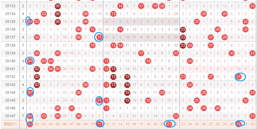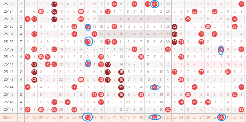 上图是福彩双色球红球号码分布走势图,我在上面图 中标注的数字是所有0尾数的数字10 20 30。看上面我蓝色小圈圈标注出来的都是0尾数的数字。最近十几期0尾数的数字出现的少,本期可以关注0尾数的数字10 20 30出1个或者2个。