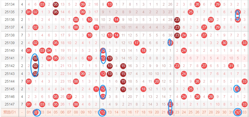 上图是福彩双色球红球号码分布走势图,我在上面图 中标注的数字是所有2尾数的数字02 12 22 32,看上面蓝色小圈圈标注出来的2尾数的数字,最近2尾数出号码不算多也不算少,本期可以关注2尾数的数字02 12 22 32出1个。个人觉得可以关注22 32出1个。