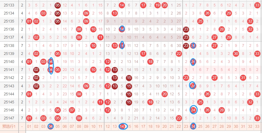 上图是福彩双色球红球号码分布走势图,我在上面图 中标注的数字是所有4尾数的数字04 14 24。看上面我蓝色小圈圈标注出来的都是4尾数的数字。最近十几期4尾数出号码不多,尤其04 14遗漏周期分布是6期和9期,本期个人觉得4尾数的数字04 14 24出1个或者2个。个人觉得可以关注14 24出1个或者2个。