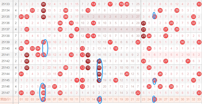 上图是福彩双色球红球号码分布走势图,我在上面图 中标注的数字是所有5尾数的数字05 15 25。看上面我蓝色小圈圈标注出来的都是5尾数的数字,你们会发现5尾数中05 15最近十几期内出现的多,个人觉得本期5尾数的数字05 15 25可以关注出0个或者1个,如果要关注的话,可以关注25。