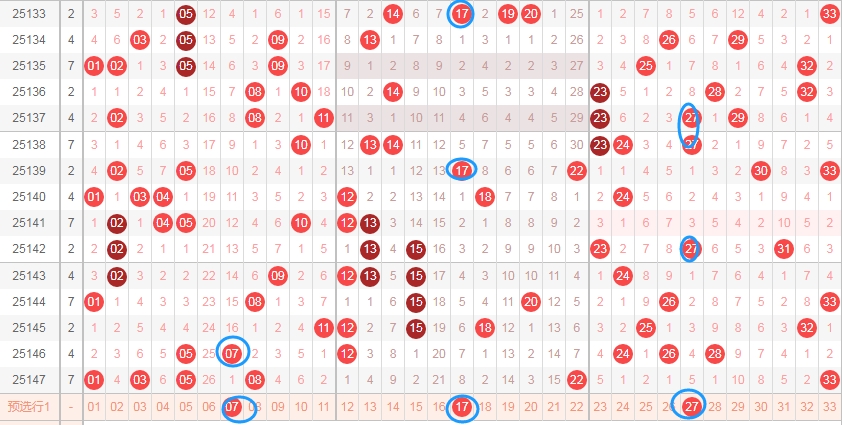 上图是福彩双色球红球号码分布走势图,我在上面图 中标注的数字是所有7尾数的数字07 17 27。看上面我蓝色小圈圈标注出来的都是7尾数的数字,你们会发现最忌十几期内7尾数的数字出的少,本期7尾数断掉的概率低,本期关注7尾数出1个或者2个。个人觉得07 17关注出1个。