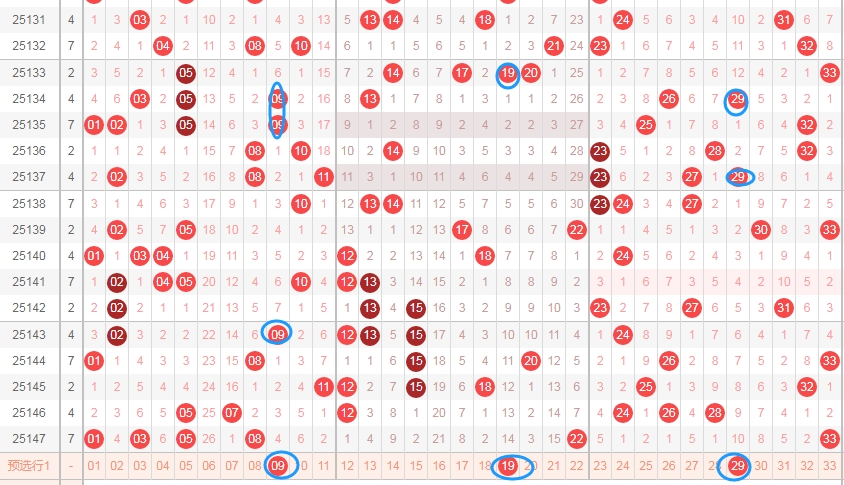 上图是福彩双色球红球号码分布走势图,我在上面图 中标注的数字是所有9尾数的数字09 19 29。看上面我蓝色小圈圈标注出来的都是9尾数的数字。个人觉得9尾数的数字09 19 29关注出1个或者2个。