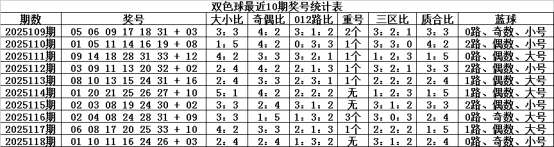 双色球第2025118期开出奖号为:01、10、11、16、24、26+03,其中红球号码奇偶比为2:4,大小比为2:4,012路比为1:3:2,和值为88,跨度为25,三区比为3:1:2,没有出现重复红球。蓝球开出奇数、小号、0路。
