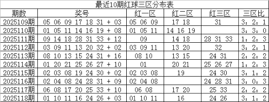 一区上期走热,开出3个红球,近10期开出24个红球,表现非常活跃,本期预计走温,开出1-2个红球,参考号码01、04;二区上期走温,开出1个红球,近10期共开出17个红球,走势相对较冷,本期预计继续温冷,在2个以内出号,注意号码12、15;三区上期走温,开出2个红球,近10期共开出19个红球,出号与理论个数持平,本期预计继续走温,出现1-2个红球,看好号码28、32;