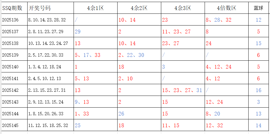 分享第一个数据分析:四分区统计数据。相对于传统的三分区,个人习惯使用四分区,就是把33个红球号码除以4,所得的余数分区如下: