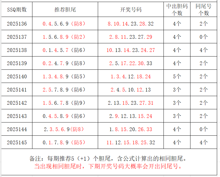 如图,每期推荐胆尾中出1-4个。上期推荐胆尾中出3尾4码!推荐胆尾是按照公式计算的顺序,不定位红球号码的顺序。本期推荐胆尾:9尾/4尾/0尾/3尾/7尾 。加推重点胆尾:***(会员专区可见)。推荐胆码号码:***(会员专区可见)。个人分析,仅供参考。