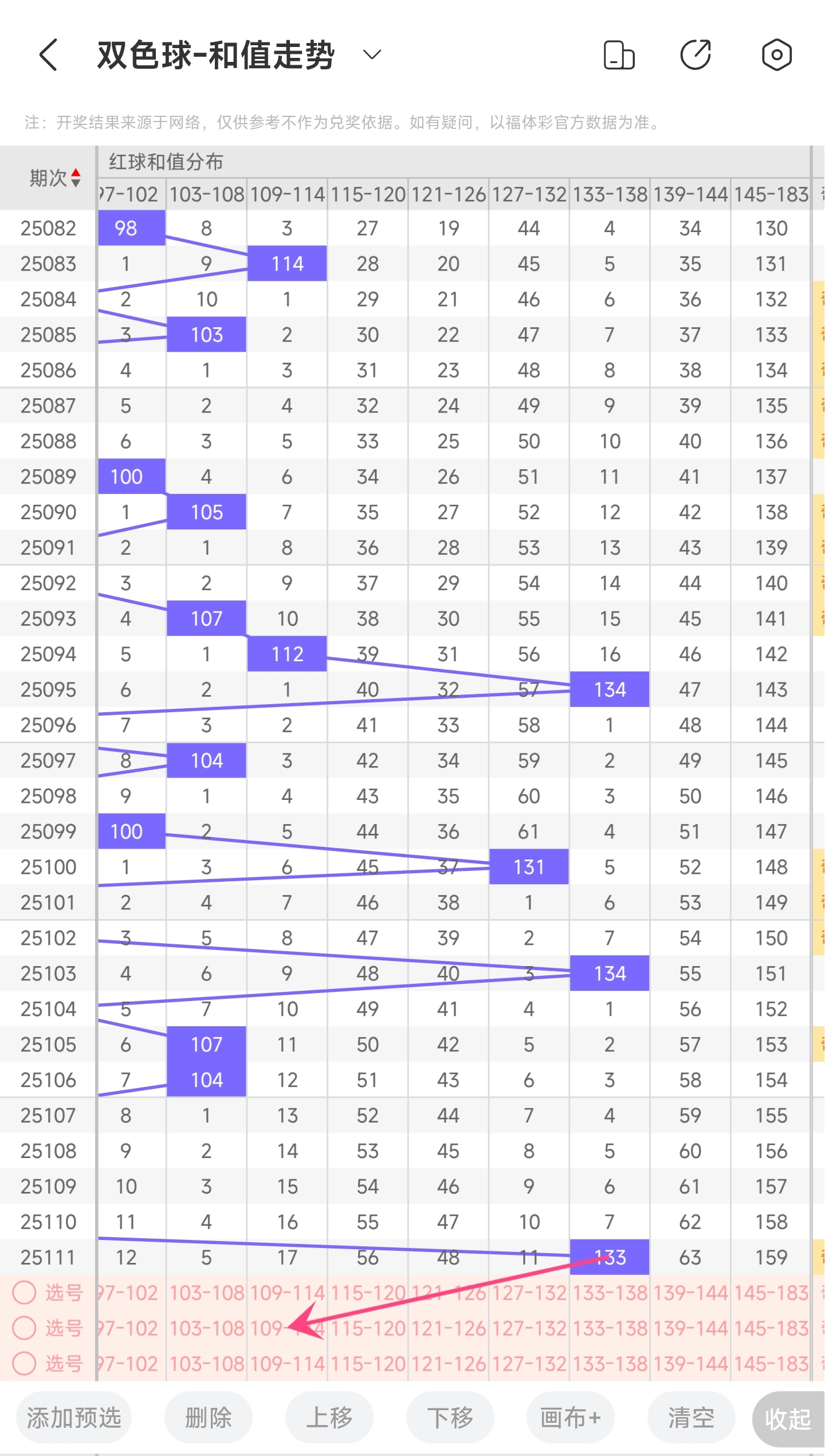 上期和值为133,而近5期和值为88,96,86,66,133均值93.8,上期和值较前一期增加了67,振幅为67。133和值是属于近30期内开出的第二大的和值,继续上升的的空间已经非常小,下降的空间很大。所以推测本期和值趋势是大概率会往左下降,和值变小,小概率继续往右,和值变大。