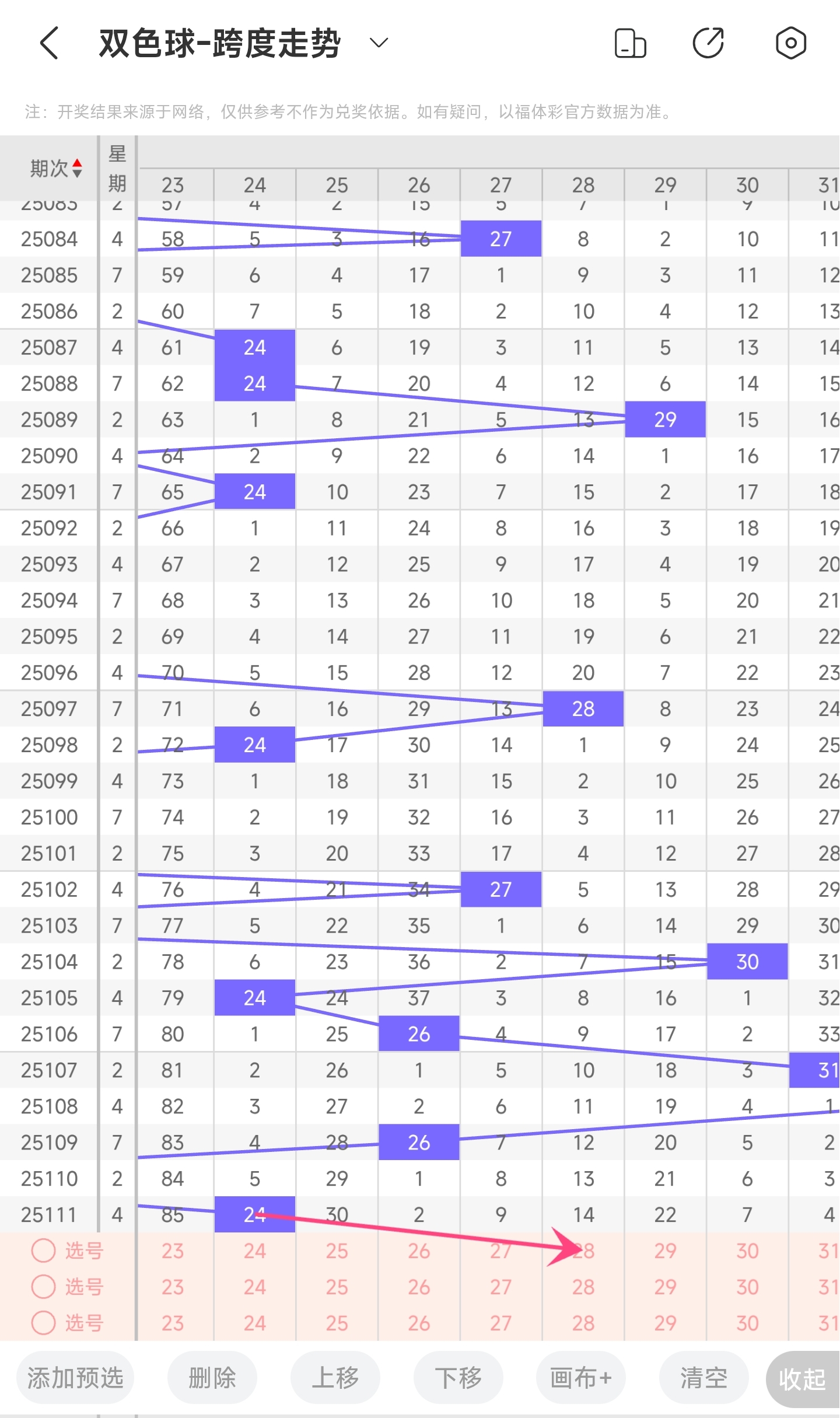 上期龙头为09,凤尾为33,跨度为24,往前一期跨度是18,偏移量为6。24跨度值是30期内开出的中间偏大的跨度值。上升的空间没有下降空间大,但考虑到龙头有可能往左开的趋势。所以推测本期跨度有较大可能是跨度变大,趋势继续往右,小概率往左,跨度变小。