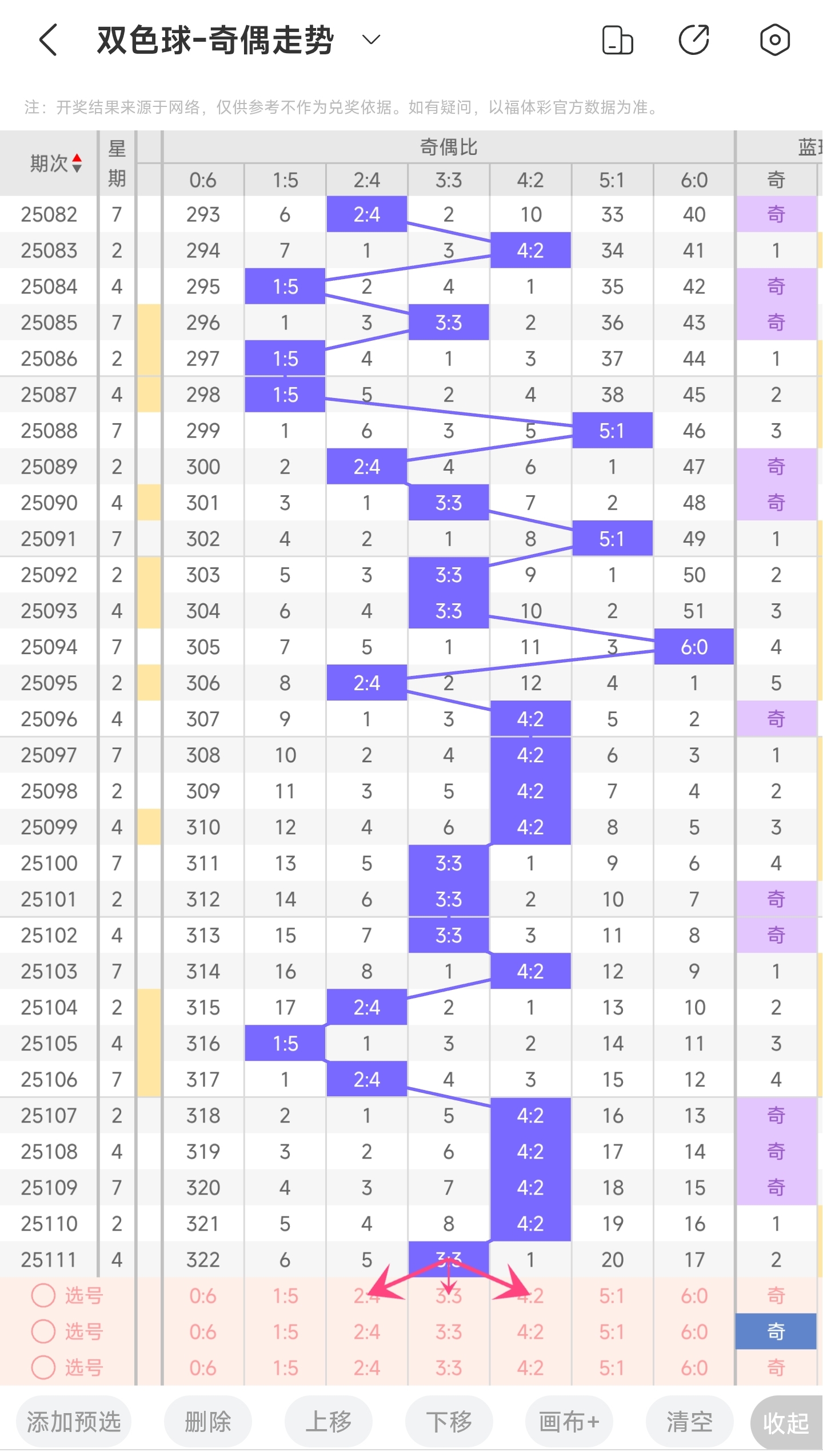 上期奇偶比为3:3,分别为奇偶偶奇奇奇。往前一期奇偶比为4:2。通过近30期内奇偶走势的数据分析,目前1:5奇偶比开出的概率是13.33%,5:1奇偶比开出的概率是6.66%,3:3奇偶比开出的概率是26.66%,4:2奇偶比开出的概率是33.33%,2:4奇偶比开出的概率是16.66%,6:0奇偶比开出的概率是3.33%。与前一期相比,3:3奇偶比概率变大了,2:4奇偶比概率变小了。通过分析走势图,可以看到3:3奇偶比是有可能连出的,而4:2奇偶比目前非常热门,也可能会开出。所以推测大概率可能会开3:3或者4:2奇偶比,其次是开2:4奇偶比,更小的概率可能会开1:5或者5:1奇偶比。