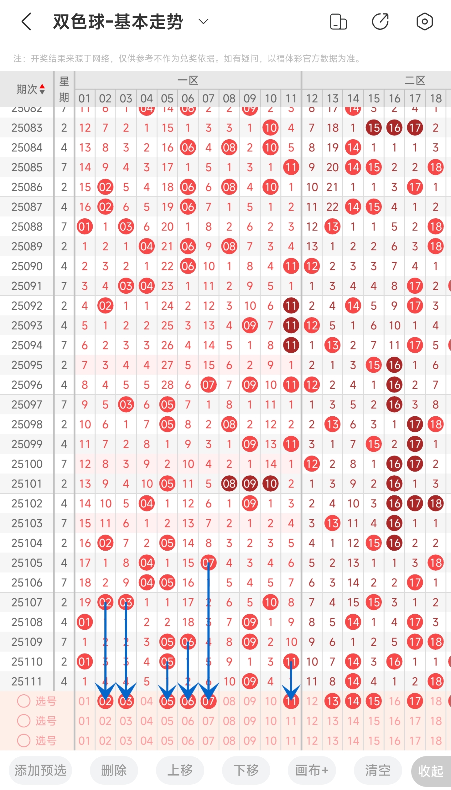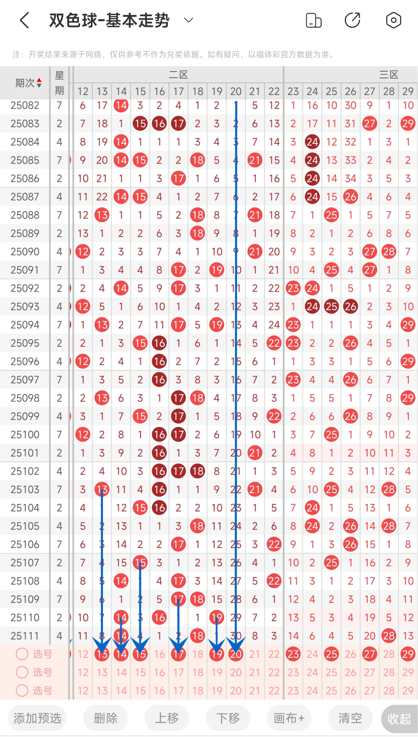 上一期二区开出了14,18等号码。往前一期开出了14,16,19。通过分析走势图,可以看到上期开出的号码也是开了比较中间的号码,结合近几期的开号趋势来看,号码也是集中在中间部分的,所以本期我们也是主要关注中间部分的号码,再兼顾一下左右两边的号码。最后结合冷热号和遗漏期数,本期我们可以关注一下13,14,15,17,19,20等号码。综上所述推测本期可能开13,14,15,17,19,20等号码。