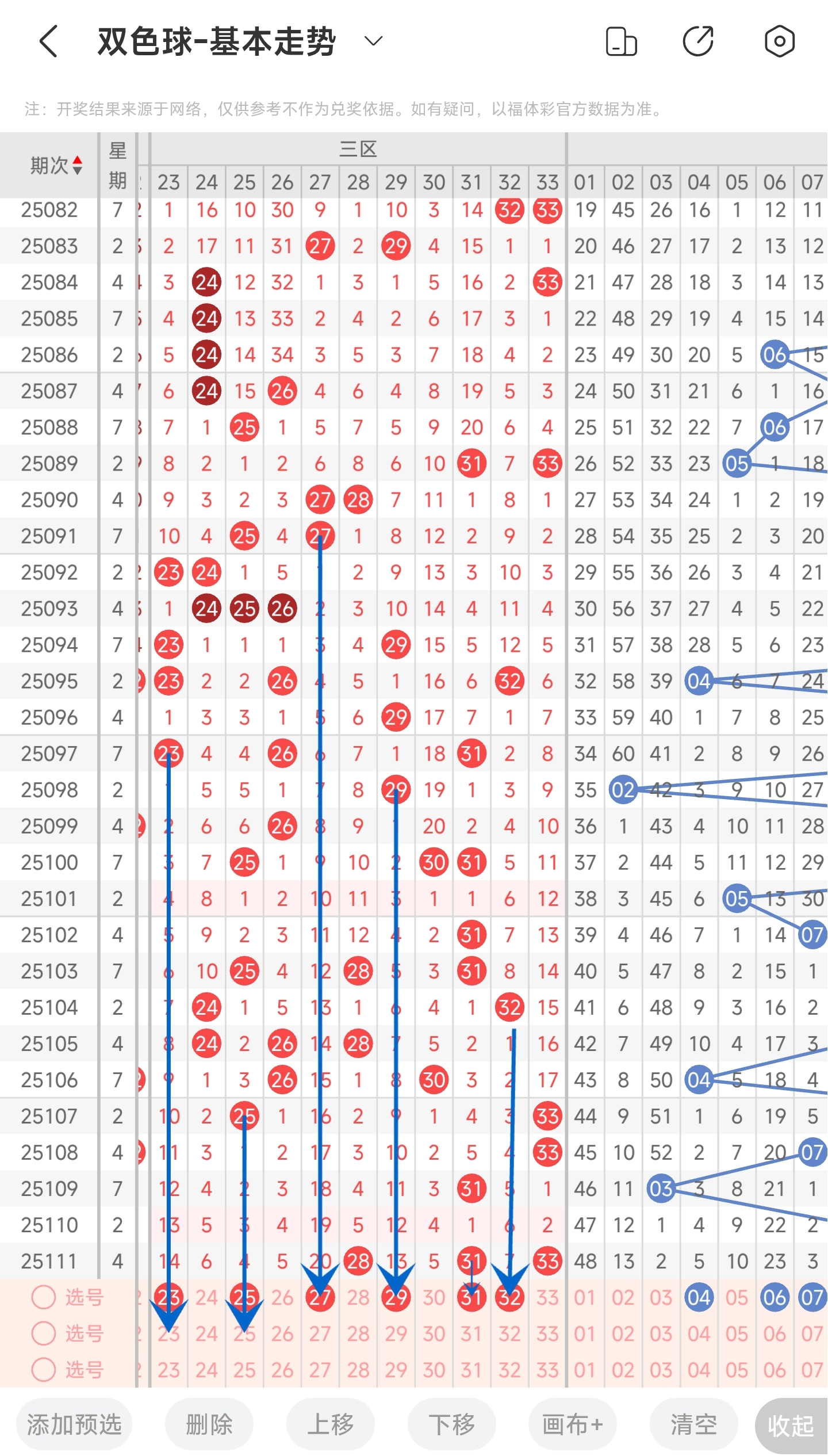 上一期三区开出了28,31,33等号码。往前一期没有开出号码。通过走势图分析,可以看到三区上期开出了3个号码,是对前一期进行了回补,推测本期开出的号码应该会有所减少。而凤尾的话,依旧是开在三区比较右边的位置,所以右边的号码还是要重点关注,但中间和左边的号码也遗漏了好几期,也需要防备一下。再结合冷热号和遗漏期数,本期我们可以关注23,25,27,29,31,32等号。综上所述本期我们推测有可能开出23,25,27,29,31,32等号码。