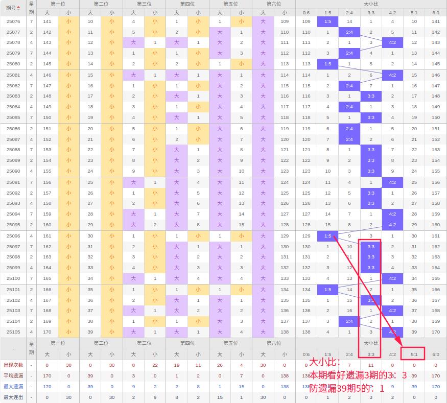 上期大小比:4:2,近10期大小比出现情况:1:5、3:3、3:3、3:3、4:2、1:5、3:3、4:2、2:4、4:2,最近10期出现4期3:3,出现3期4:2,出1期2:4,出现0期5:1,出现2期1:5,出现0期6:0,出现0期0:6,根据近10期规律本期看好遗漏3期的3:3,防遗漏39期的5:1,综上所述推荐大小比推荐:5:1,重点关注:3:3。