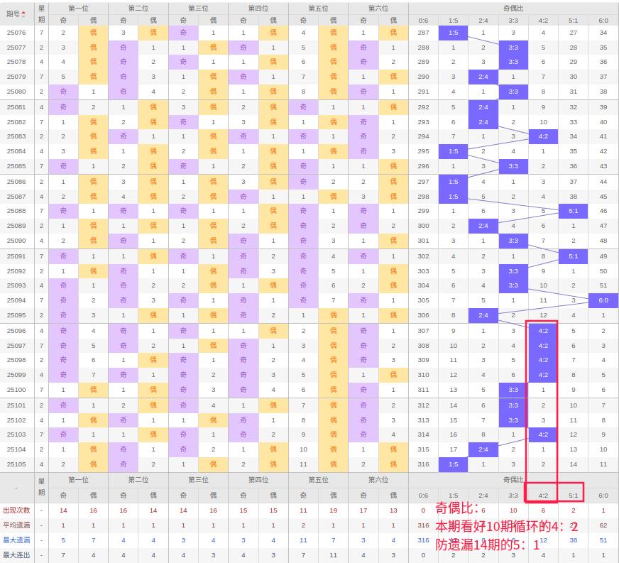 上期奇偶比:1:5,近10期奇偶比出现情况:4:2、4:2、4:2、4:2、3:3、3:3、3:3、4:2、2:4、1:5,最近10期出现3期3:3,出现5期4:2,出现1期2:4,出现0期5:1,出现1期1:5,出现0期6:0,出现0期0:6,根据近10期规律本期看好10期循环的4:2,防遗漏14期的5:1,综上所述推荐奇偶比推荐:5:1,重点关注:4:2。