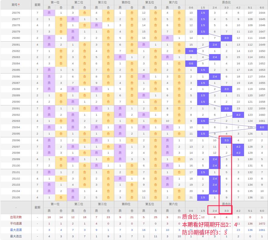 上期质合比:1:5,近10期质合比出现情况:3:3、4:2、4:2、2:4、2:4、1:5、2:4、2:4、2:4、1:5,最近10期出1期3:3,出现2期4:2,出现5期2:4,出现0期5:1,出现2期1:5,出现0期6:0,出现0期0:6,根据近10期规律本期看好隔期开出2:4,防10期循环的3:3,综上所述推荐质合比推荐:3:3,重点关注:2:4。