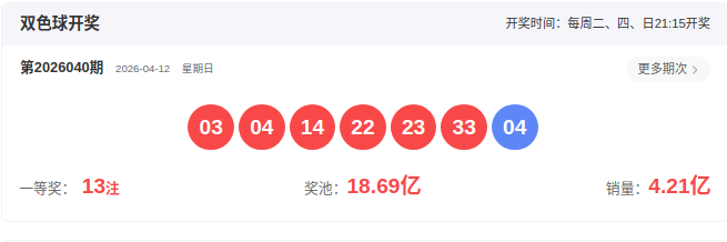开奖号码:03 04 14 22 23 33-04