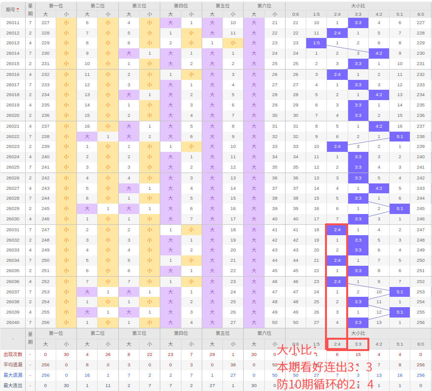 上期大小比:3:3,近10期大小比出现情况:2:4、3:3、3:3、2:4、3:3、2:4、5:1、3:3、5:1、3:3,最近10期出现5期3:3,出现0期4:2,出3期2:4,出现2期5:1,出现0期1:5,出现0期6:0,出现0期0:6,根据近10期规律本期看好连出的3:3,防10期循环的2:4,综上所述推荐大小比推荐:2:4,重点关注:3:3。