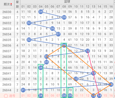 结合走势图综合判断, 蓝球推荐关注号码:04、08、09、13、14。