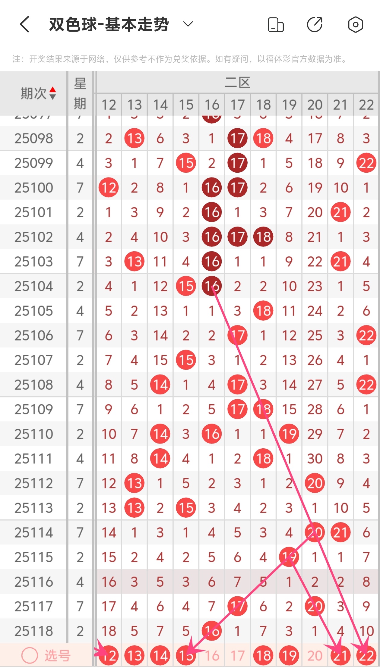 上期第二区间开出16,本期我们可以从上面走势图中看到选号的思路,12为斜连走势,15为斜连走势,21为斜连走势,22为斜连走势,综合以上分析本期第二区间推荐12 13 14 15 18 19 21 22