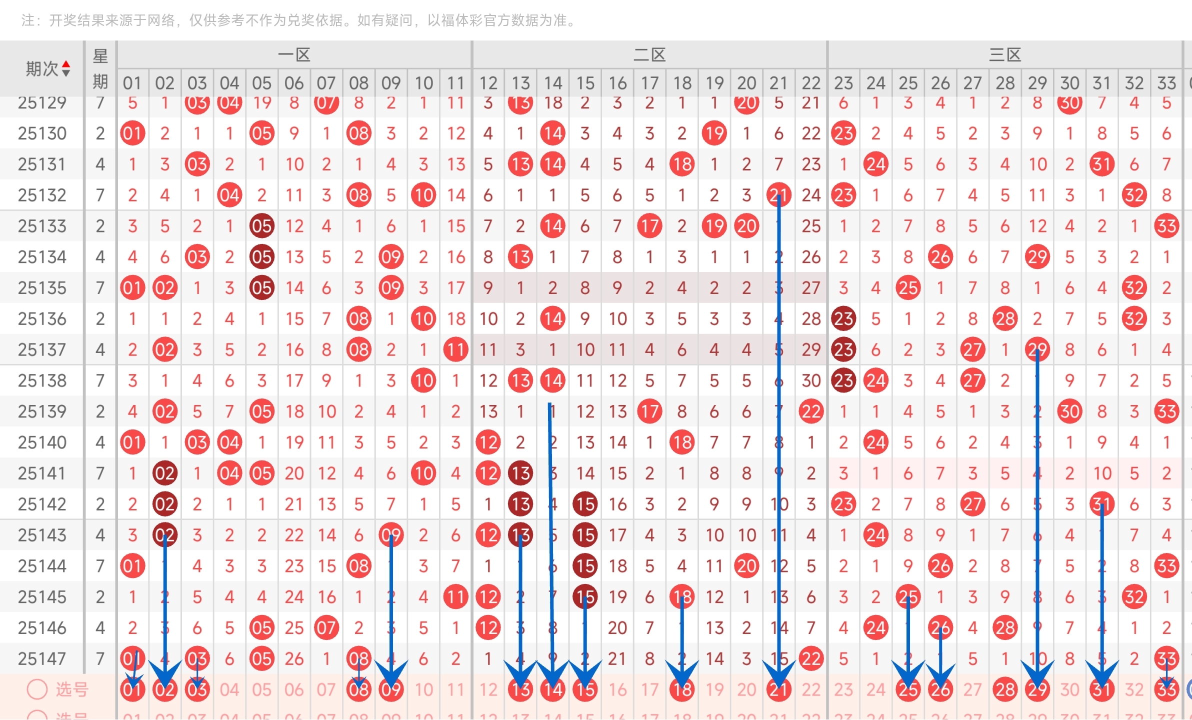 上一期三区开出了33号球。往前一期开出了242628号球。通过走势图分析,可以看到上期开33号球,本期可能继续开在右边,从最近三区开号位置来看,比较均匀,所以本期我们可以均匀关注一下三区的号码。最后再结合冷热号和遗漏期数,本期我们可以关注2526293133等号。综上所述本期我们推测有可能开出2526293133等号码。