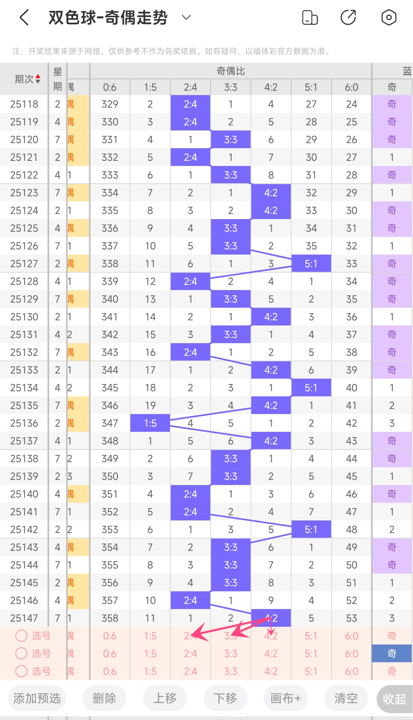 上期奇偶比为4:2,分别为奇奇奇偶偶奇。往前一期奇偶比为2:4。通过近30期内奇偶走势的数据分析,目前1:5奇偶比开出的概率是3.33%5:1奇偶比开出的概率是10%3:3奇偶比开出的概率是36.66%4:2奇偶比开出的概率是23.33%2:4奇偶比开出的概率是26.66%6:0奇偶比开出的概率是0%。与前一期相比,4:2概率变大,3:3概率变小。通过分析走势图,上期开了4:2奇偶比,目本期看好3:3奇偶比。所以本期推测本期可能开3:3奇偶比,其次是2:4奇偶比或者4:2奇偶比,最后是1:55:1奇偶比。