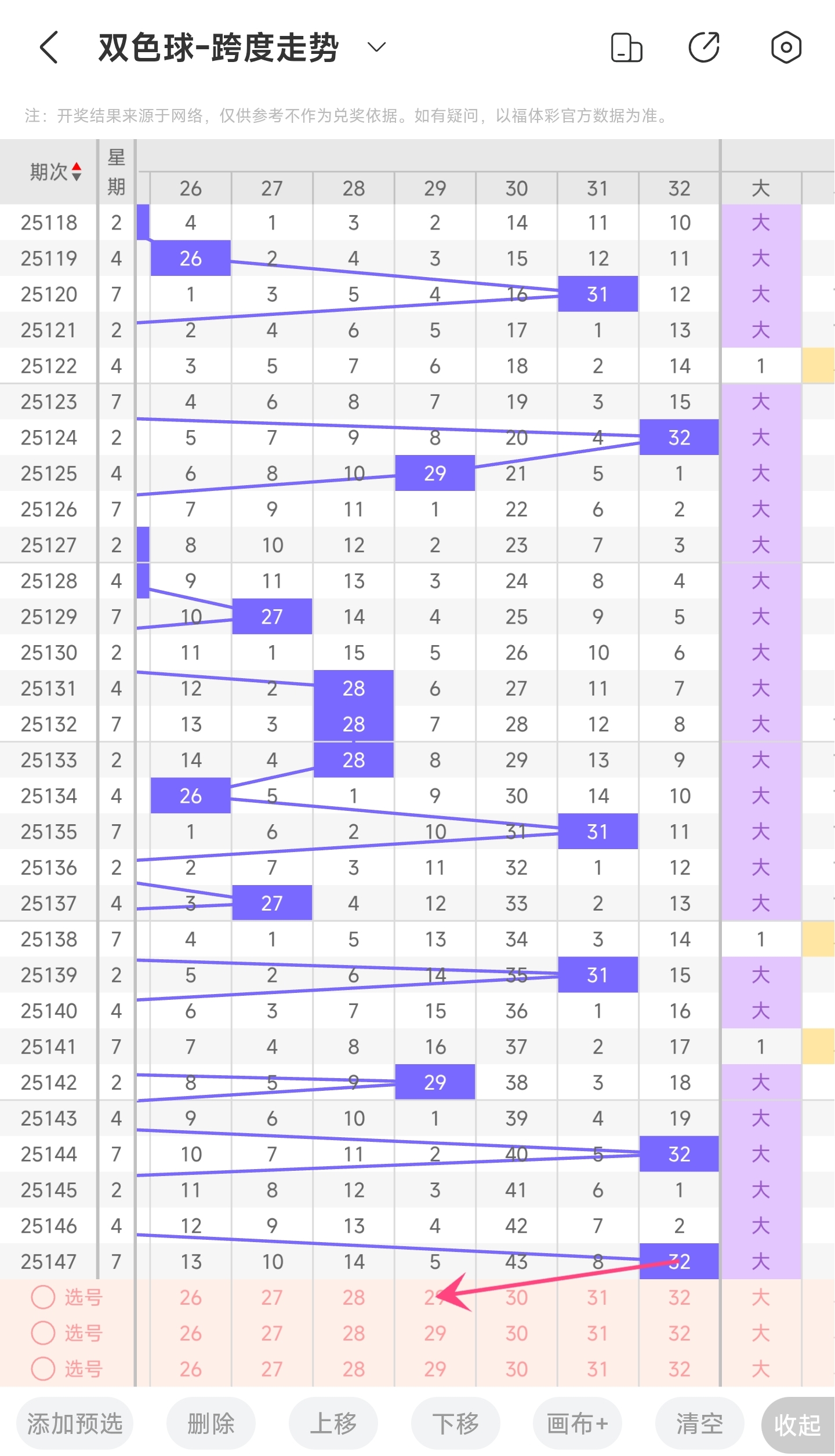 上期龙头为1,凤尾为33,跨度为32,往前一期跨度是23,偏移量为932跨度值是30期内开出的最大的跨度值。下降的空间很大,已经没有上升的空间了,本期看好跨度变小,所以推测本期跨度趋势是往左的,跨度变小,小概率保持不变。