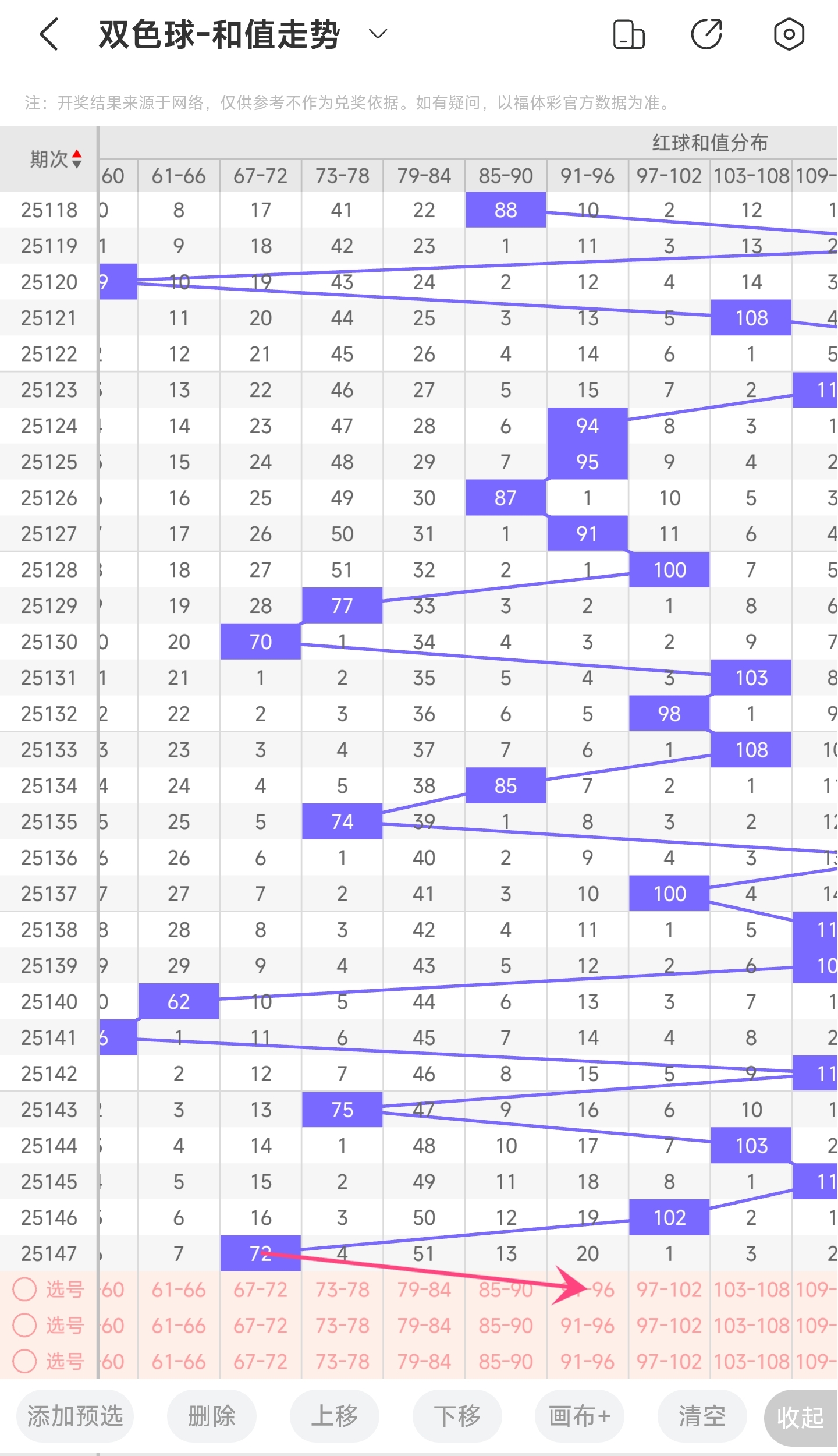 上期和值为72,而近5期和值7510311310272,上期和值较前一期减少了30,振幅为3072和值是属于近30期内开出的很小的和值,下降的空间非常小,上升的空间很大。本期看好和值变大,所以推测本期和值趋势是大概率往右,和值变大,小概率往左,和值变小。