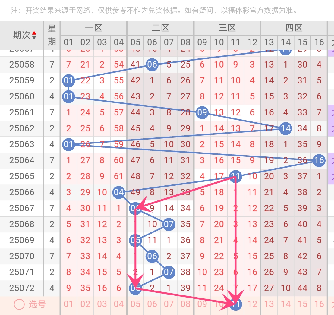 - 连号与重号新策略:连号率保持70%,但形态变化:三连号出现率从10%升至20%(如2025061期09-10-11)。重号中,斜连号(±1的邻号)概率高于直重(如32→33)。推荐1组双连号+1斜连号。