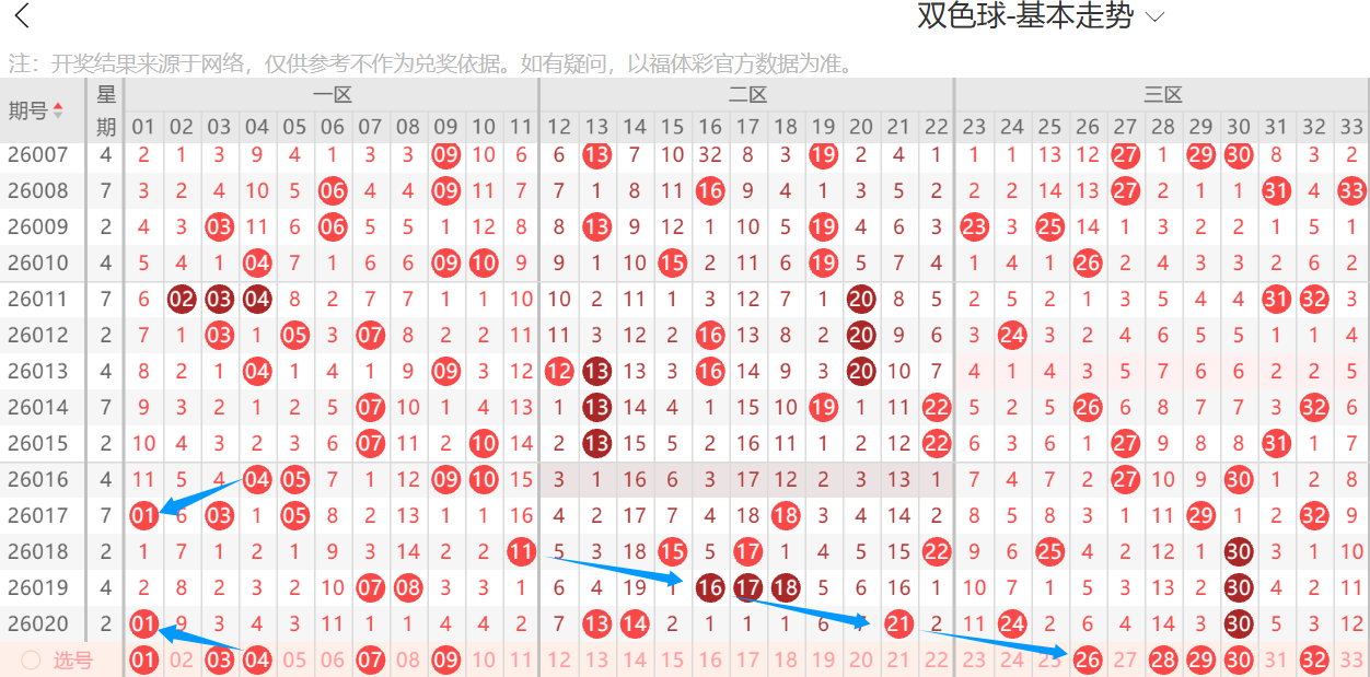 双色球26021期分析,上期中胆码30,条件思路多数正确
