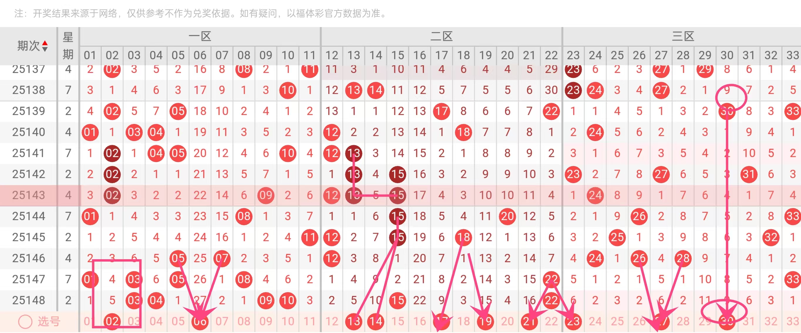 27、30:近期大号尾数7、0表现较弱,27与30在历史同期(12月底)出现频率较高,且与近期热号26、28形成斜连号趋势。