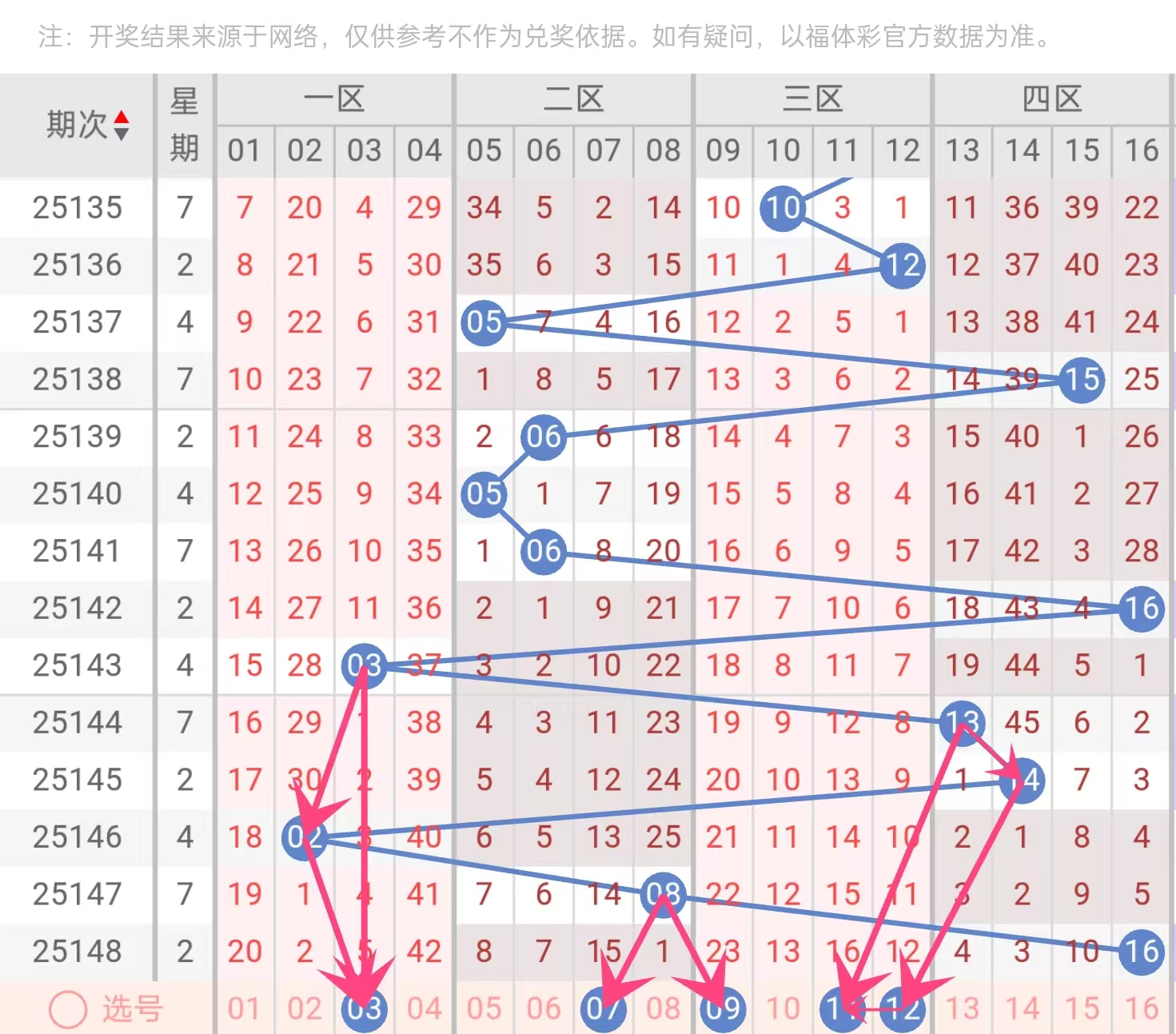 近期蓝球以大号偶数为主(14、16、08),历史规律显示连续大号后常转向中小号(01–12)。