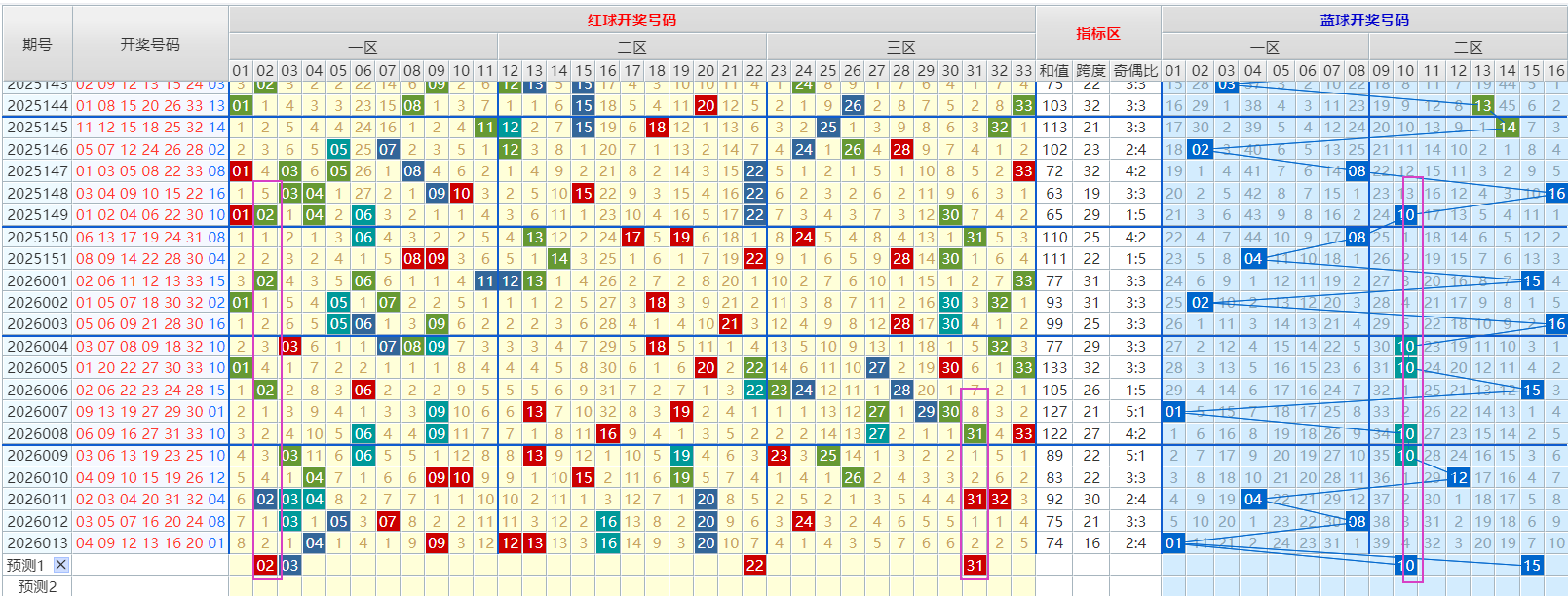 红球三区:上期开出0个号码,上期本区偶数开出0个,奇数开出0个;质数开出0个,合数开出0个。近几期本区出球相对平稳,属于一个恒温区间,本期可以继续关注此形态的表现。从以上走势图分析,号码31-32-33以及30-31-32形成的斜连码走势以及近期它本本身热码形态的表现,可以注意一下。