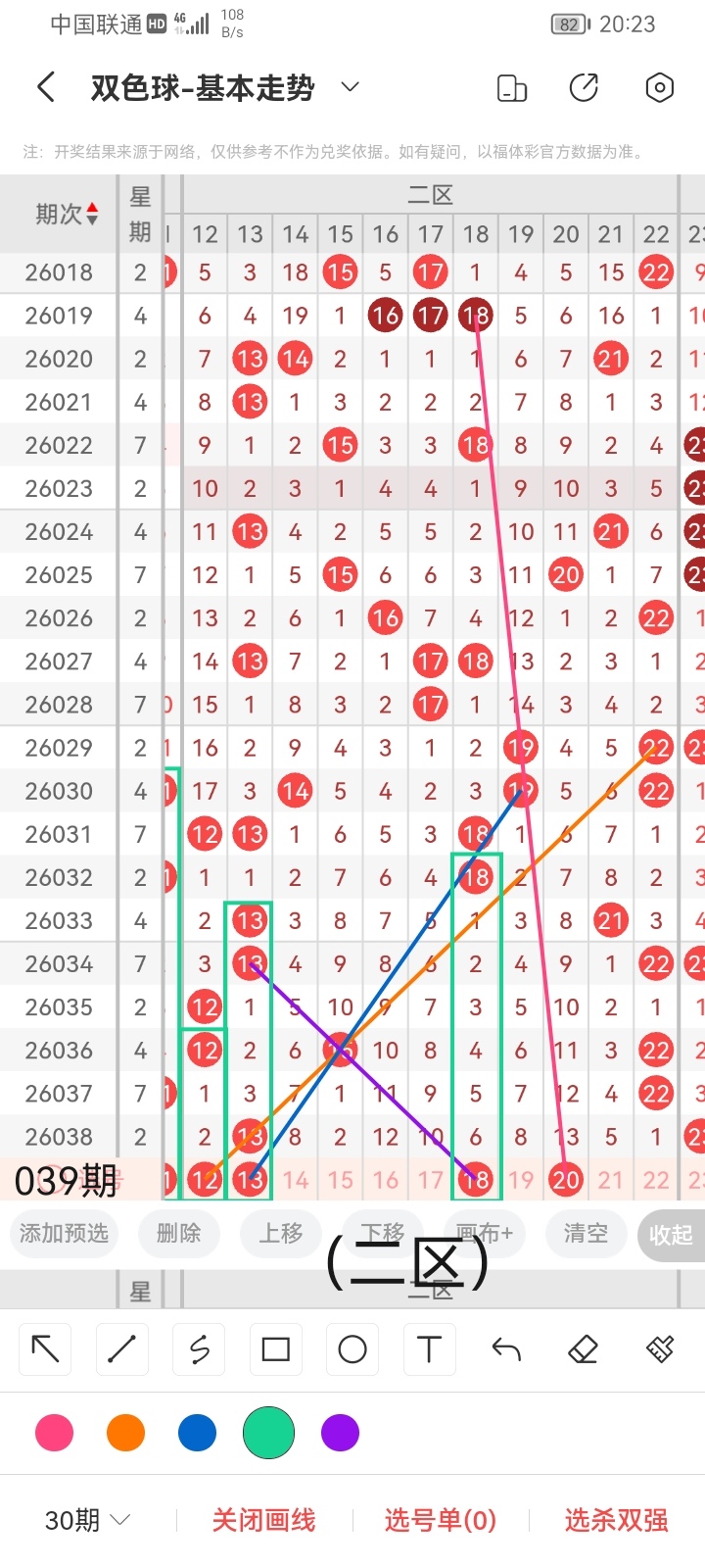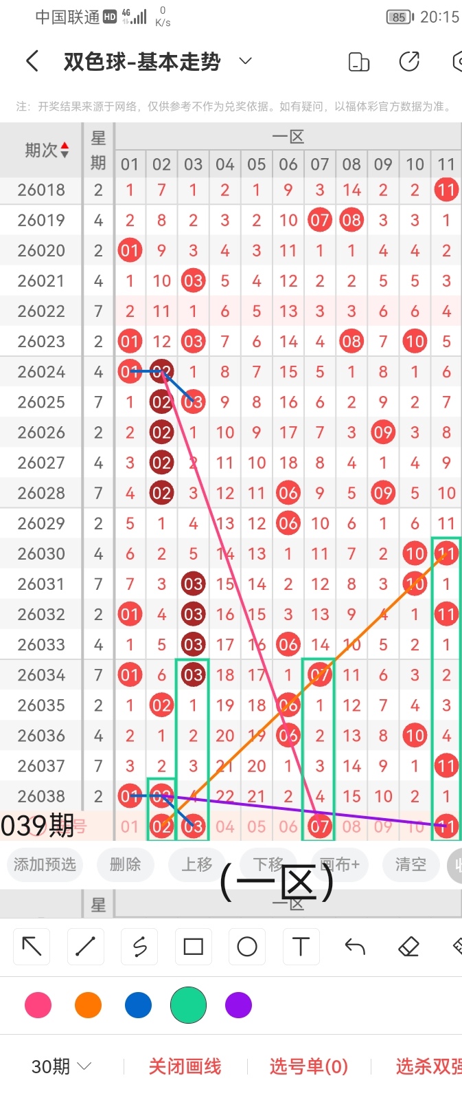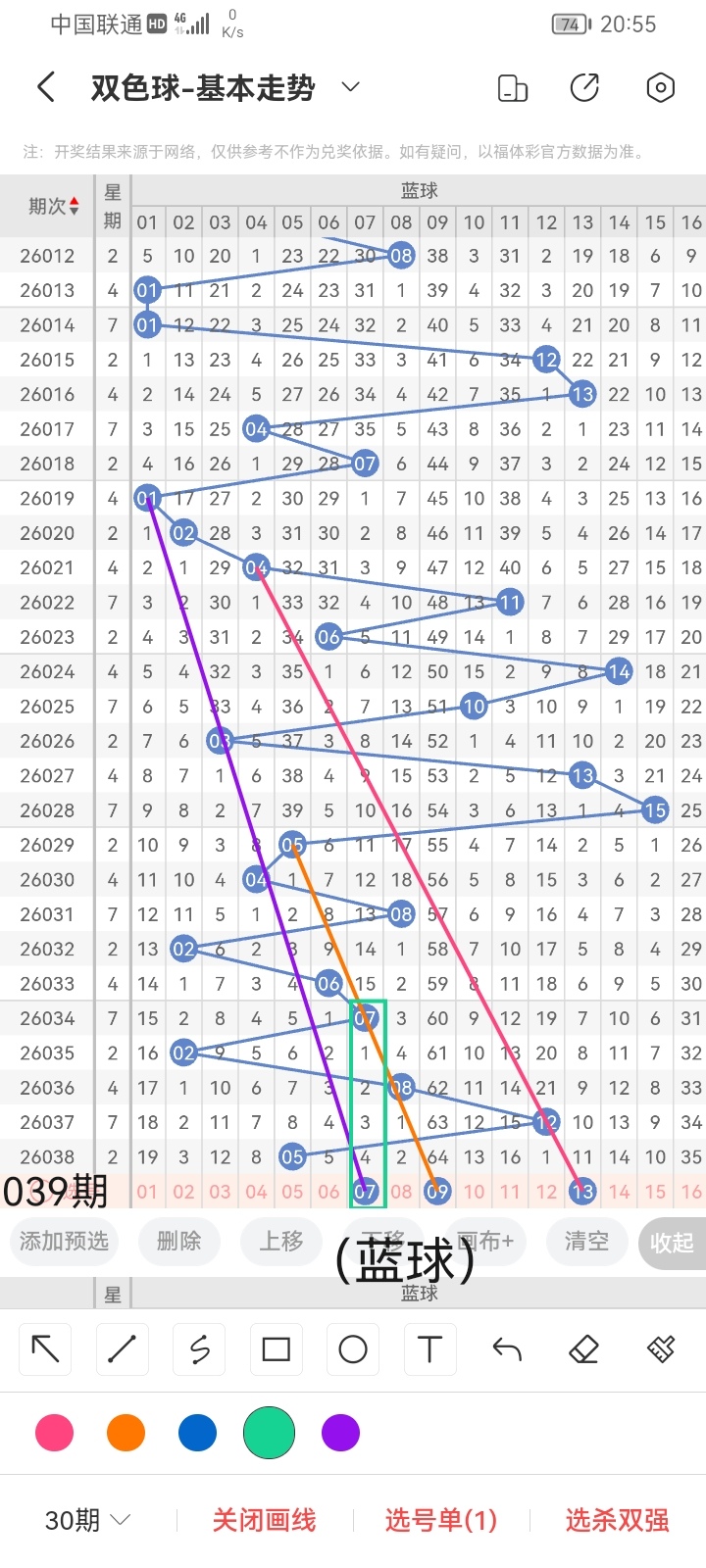 小梁结合上面图中画线思路分析得出,最后给大家汇总提供一下本期红球、蓝球数据,供大家参考: