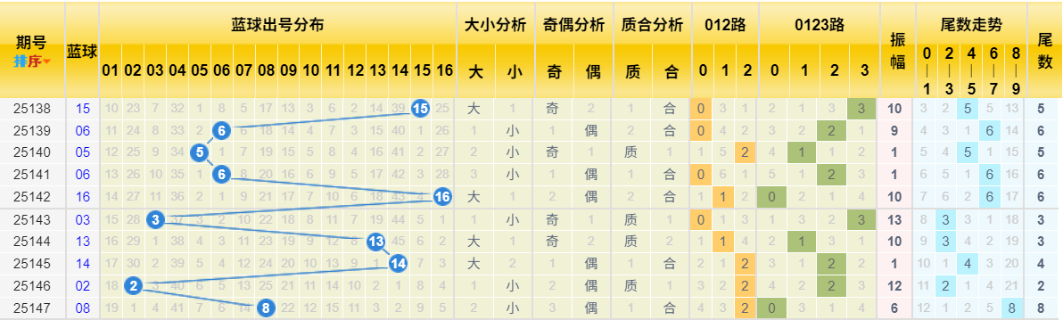 选号提示:依据规律,本期蓝球可选参考:03, 06, 09, 12, 15 (0路) 及 01, 04, 07, 10, 13, 16 (1路)。