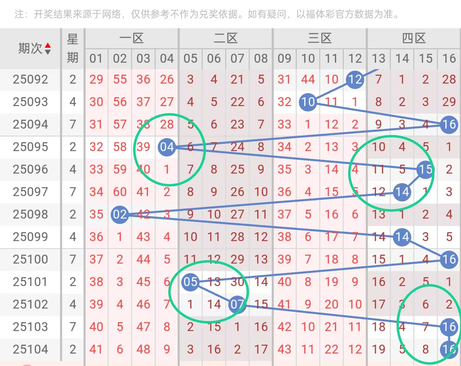 过热后回调:16在近30期中出现5次,是出现频率最高的蓝球之一,尤其是在2025104、2025103、2025100等期连续开出,过热明显。