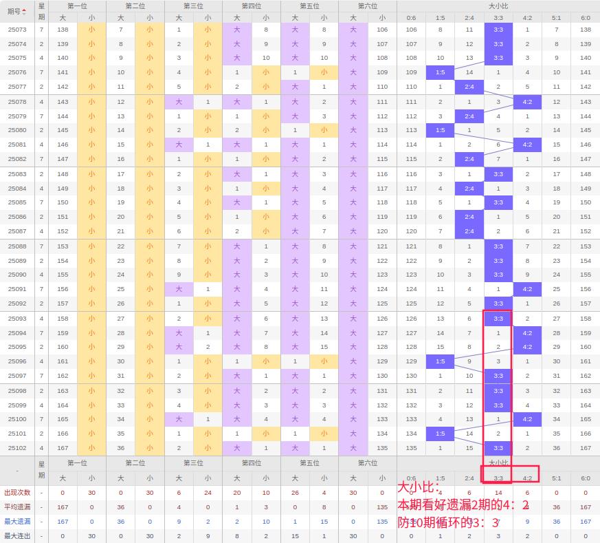 上期大小比:3:3,近10期大小比出现情况:3:3、4:2、4:2、1:5、3:3、3:3、3:3、4:2、1:5、3:3,最近10期出现5期3:3,出现3期4:2,出0期2:4,出现0期5:1,出现2期1:5,出现0期6:0,出现0期0:6,根据近10期规律本期看好遗漏2期4:2,防10期循环的3:3,综上所述推荐大小比推荐:3:3,重点关注:4:2。