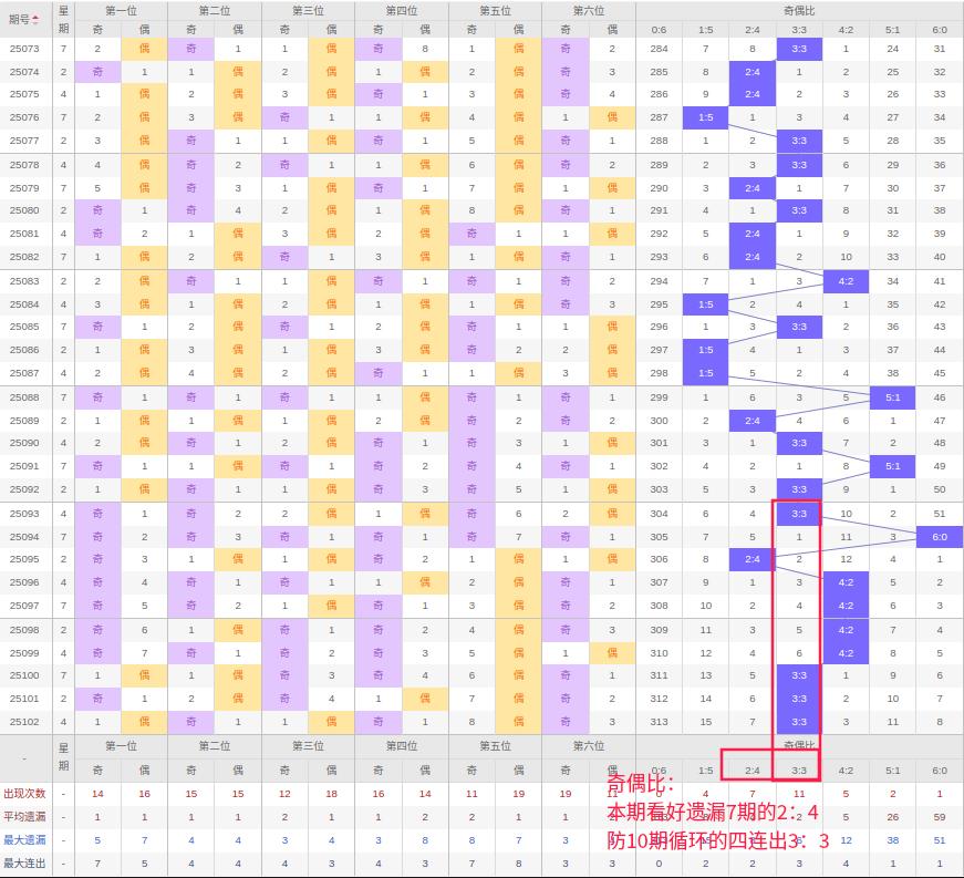 上期奇偶比:3:3,近10期奇偶比出现情况:3:3、6:0、2:4、4:2、4:2、4:2、4:2、3:3、3:3、3:3,最近10期出现4期3:3,出现4期4:2,出现1期2:4,出现1期5:1,出现0期1:5,出现1期6:0,出现0期0:6,根据近10期规律本期看好遗漏7期的2:4,防10期循环的四连出3:3,综上所述推荐奇偶比推荐:3:3,重点关注:2:4。