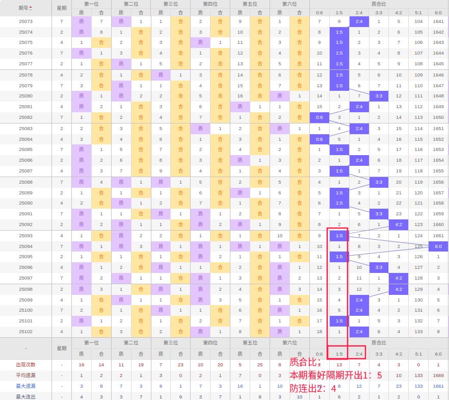 上期质合比:2:4,近10期质合比出现情况:1:5、6:0、1:5、3:3、4:2、4:2、2:4、2:4、1:5、2:4,最近10期出1期3:3,出现3期4:2,出现2期2:4,出现0期5:1,出现3期1:5,出现1期6:0,出现0期0:6,根据近10期规律本期看好隔期开出1:5,防连出2:4,综上所述推荐质合比推荐:2:4,重点关注:1:5。