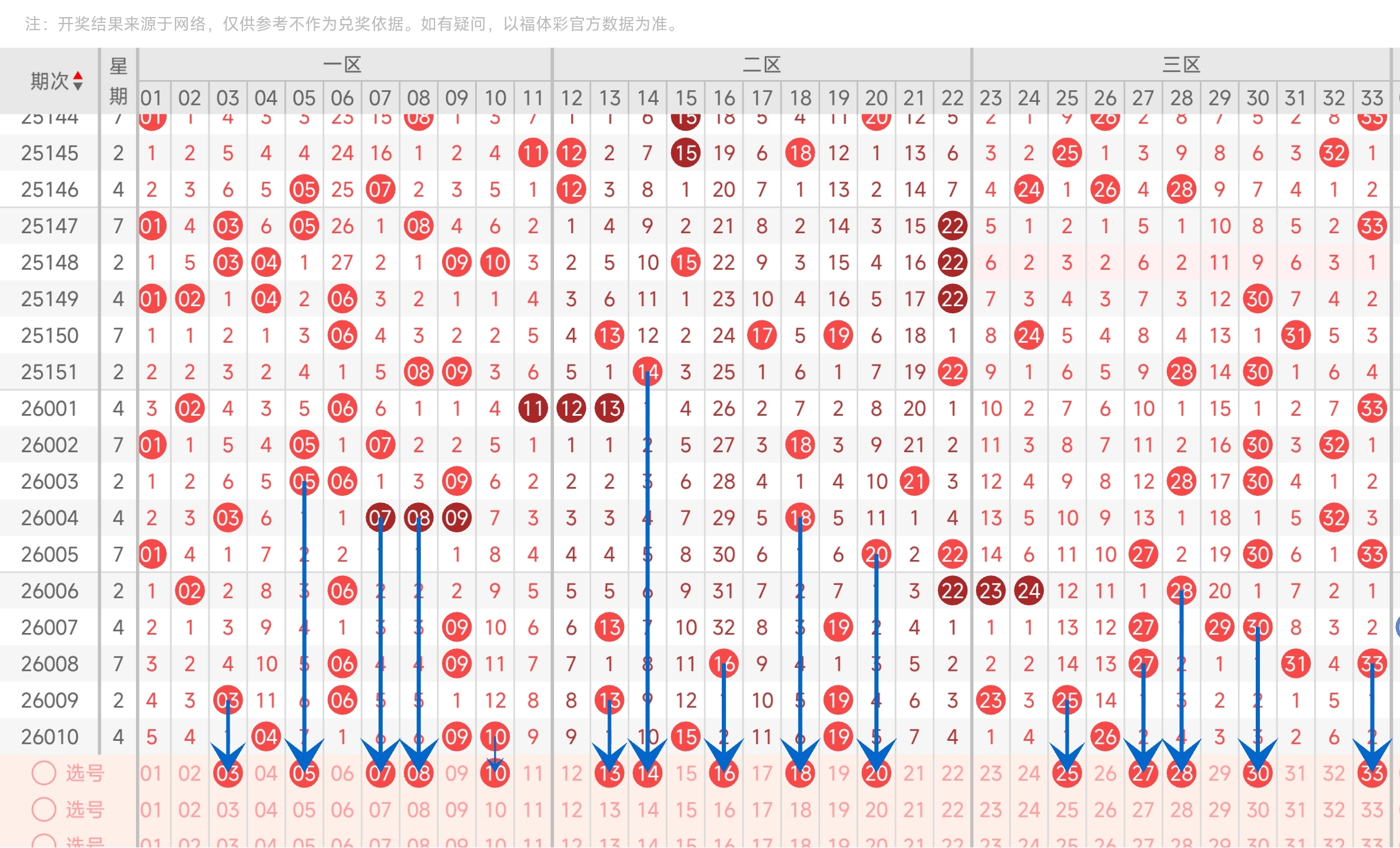 上一期三区开出了26号球。往前一期开2325号球。通过走势图分析,可以看到上期凤尾开了26,本期比较大的概率可能会继续往右移动,所以本期中间和右边的号码都要关注一下,其次是往左的话可以防1码。最后再结合冷热号和遗漏期数,本期我们可以关注2527283033等号。综上所述本期我们推测有可能开出2527283033等号码。