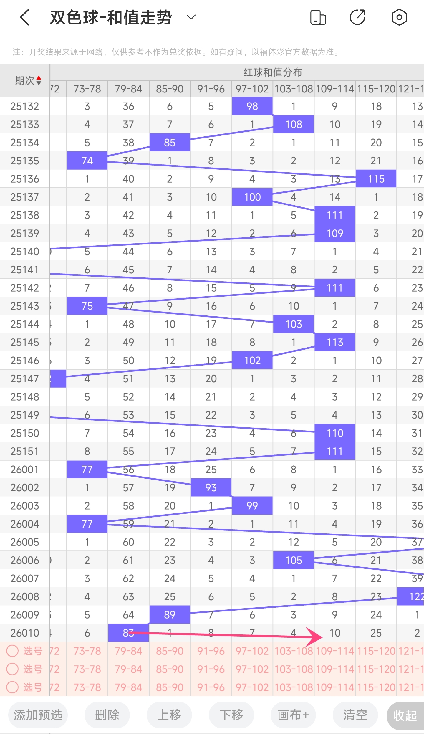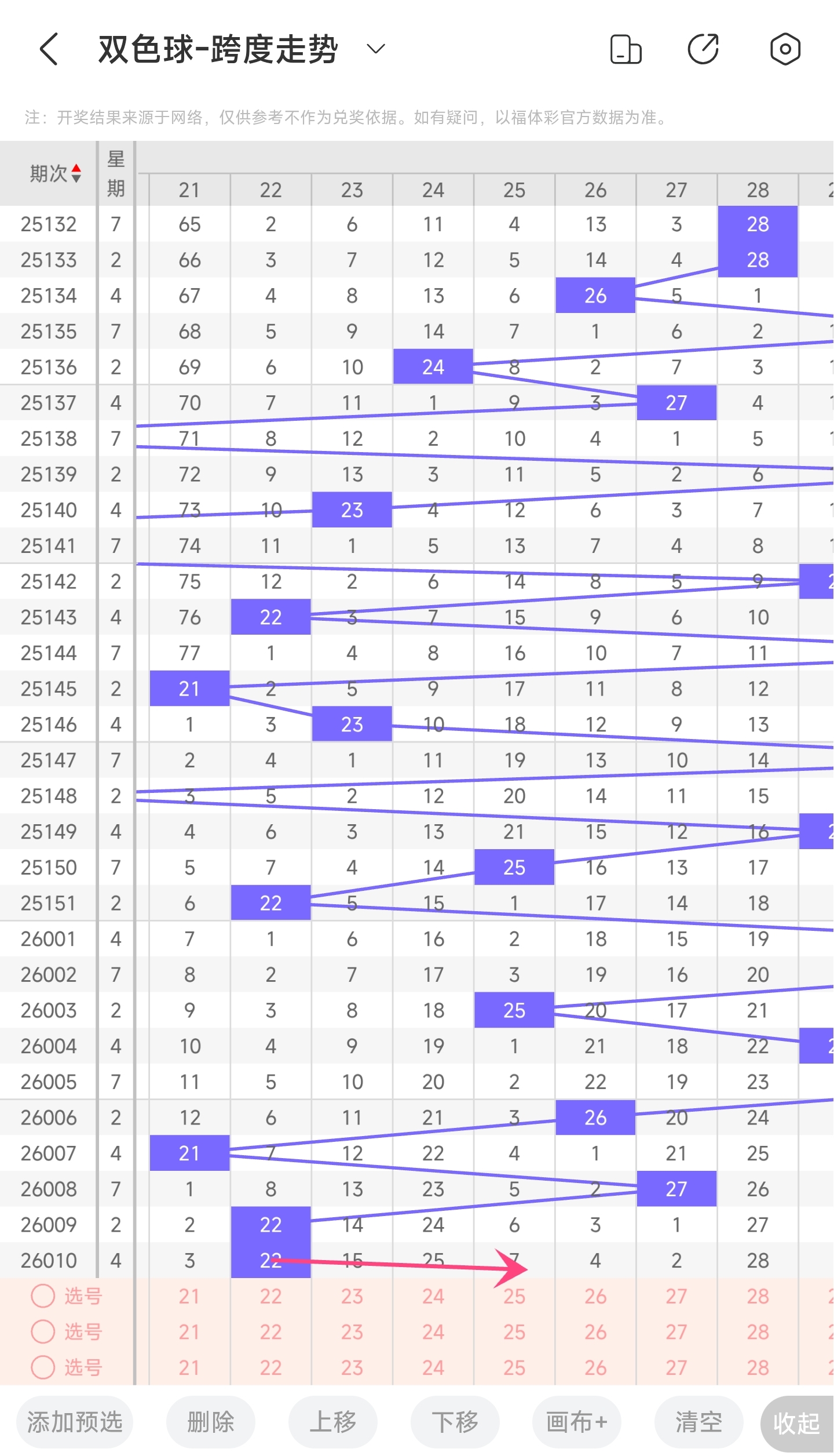 上期龙头为4,凤尾为26,跨度为22,往前一期跨度是22,偏移量为022跨度值是30期内开出比较小跨度值。上升的空间很大,下降空间很小,本期看好跨度变大,所以推测本期跨度趋势是往右的,跨度变大,极小概率往左,跨度变小。