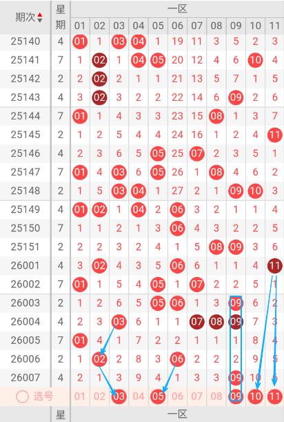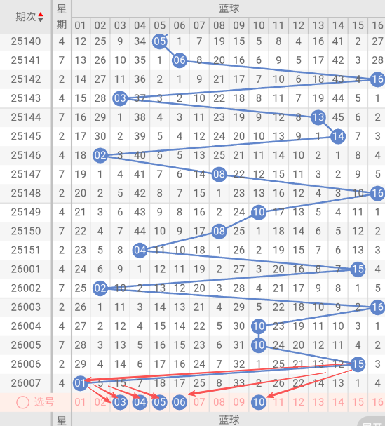根据走势图近10期的走势看,蓝球在151期开出04蓝球之后,1大1小4大1小,再看下近10期的蓝球中冷码有回补的趋势,这种趋势规律本期判断极有可能开出小号,本期防蓝球10小号,蓝球本期重点关注03,04,05,06,10
