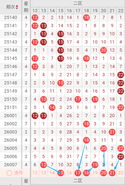 根据走势图可以看出当前区段,148期开出15.22二个号码球 ,149期开出22一个号码球 ,150期开出13.17.19三个号码球 ,001期开出12.13二个号码球 ,002期开出18一个号码球 ,003期开出21一个号码球 ,004期开出18一个号码球 ,005期开出20.22二个号码球 ,006期开出22一个号码球 ,007期开出13.19二个号码球 ,按照如此规律本期当前区可能开出1双1单。我们看下当前区上期没有开出重叠号,那么本期当前区要定重叠号的情况下可关注13号码球。再看下当前区上期没有开出斜连号,当期选号得留意斜连20号码球。本区重点关注15.17.18.20.21