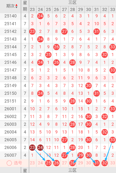 根据走势图可以看出当前区,148期没有开出号码球 ,149期开出30一个号码球 ,150期开出24.31二个号码球 ,001期开出33一个号码球 ,002期开出30.32二个号码球 ,003期开出28.30二个号码球 ,004期开出32一个号码球 ,005期开出27.28.33三个号码球 ,006期开出23.24.28三个号码球 ,007期开出27.29.30三个号码球 ,按照如此规律判断本期当前区可能开出1单或2单。我们看下当前区上期没有开出重叠号,那么本期当前区要定重叠号的情况下可关注27码球。再看下当前区上期开出27.29斜连号,当期选号得留意31斜连号。本区重点关注25.06.28.31.32