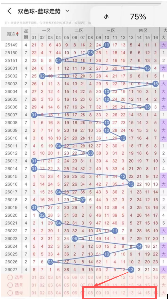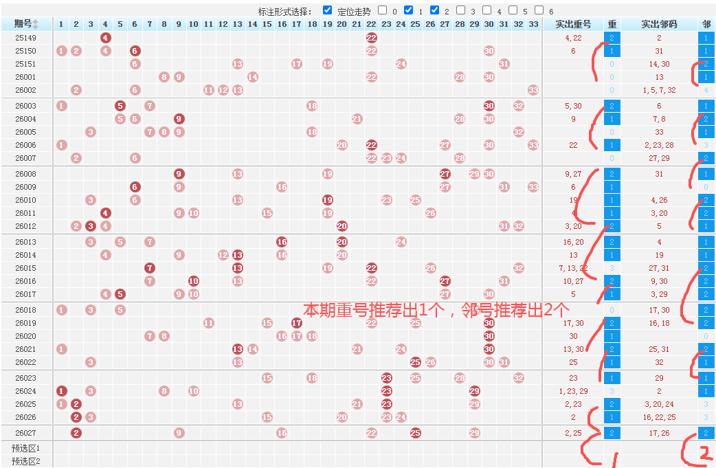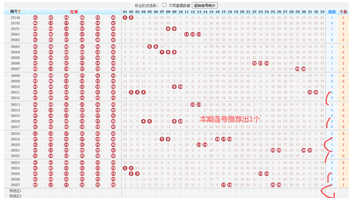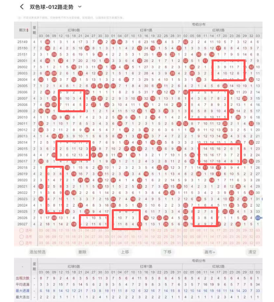 近10期数据显示,本期需注意02、 03、 15、 25、26等红球多次出现,整体趋势活跃,其中02、03、25 多次出现,属于高频热号,热号居高不下,本期建议考虑03、14、、26、30、33作为重点参考。
