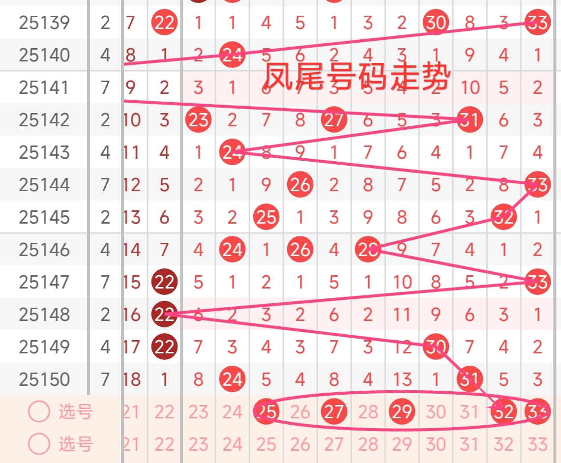 上期凤尾号码为31,振幅上升了1点,开出了奇数号码。回顾近期凤尾号码,振幅波动较大。上期凤尾号码为31,为奇数号码。根据近期凤尾号码走势来看,近期凤尾号码开出波动幅度较大,近期凤尾号码在红二区与红三区之间波动。上期凤尾为31,处于大号区。根据历史凤尾号码走势来看,凤尾号码多集中在大数号码区间。预计本期凤尾号码仍会在这个区间内选择,预计本期凤尾号码可以注意25 - 33区间开出。这些号码在历史开奖中出现频率较高,且符合当前的走势规律。本期还需注意一些连续漏出的冷码有望在本期热出。本期凤尾号码可重点关注25、27、29、32、33。