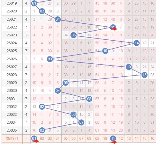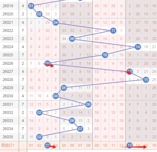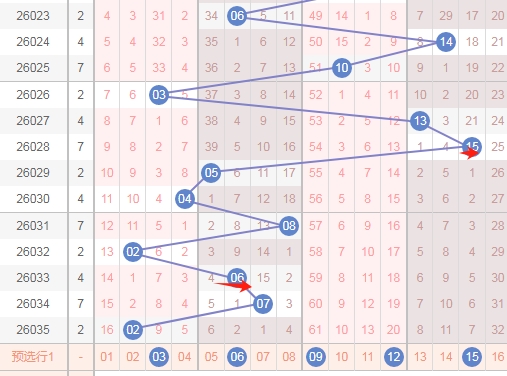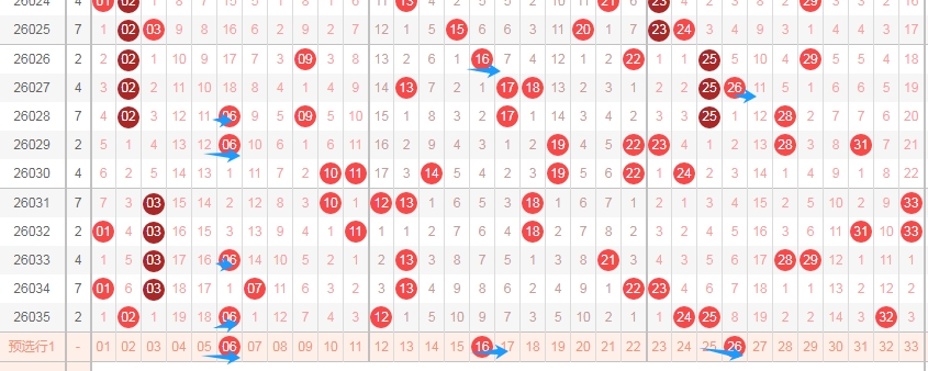 上图是福彩双色球红球开奖号码走势分布图,我标注出来的数字6尾数数字06 16 26上期开出了一个,最近十期内6尾数数字06 16 26出号码不多,16 26这两个最近8期是一个数字没出现。那么本期可以继续看6尾数的数字06 16 26出一个或者两个。